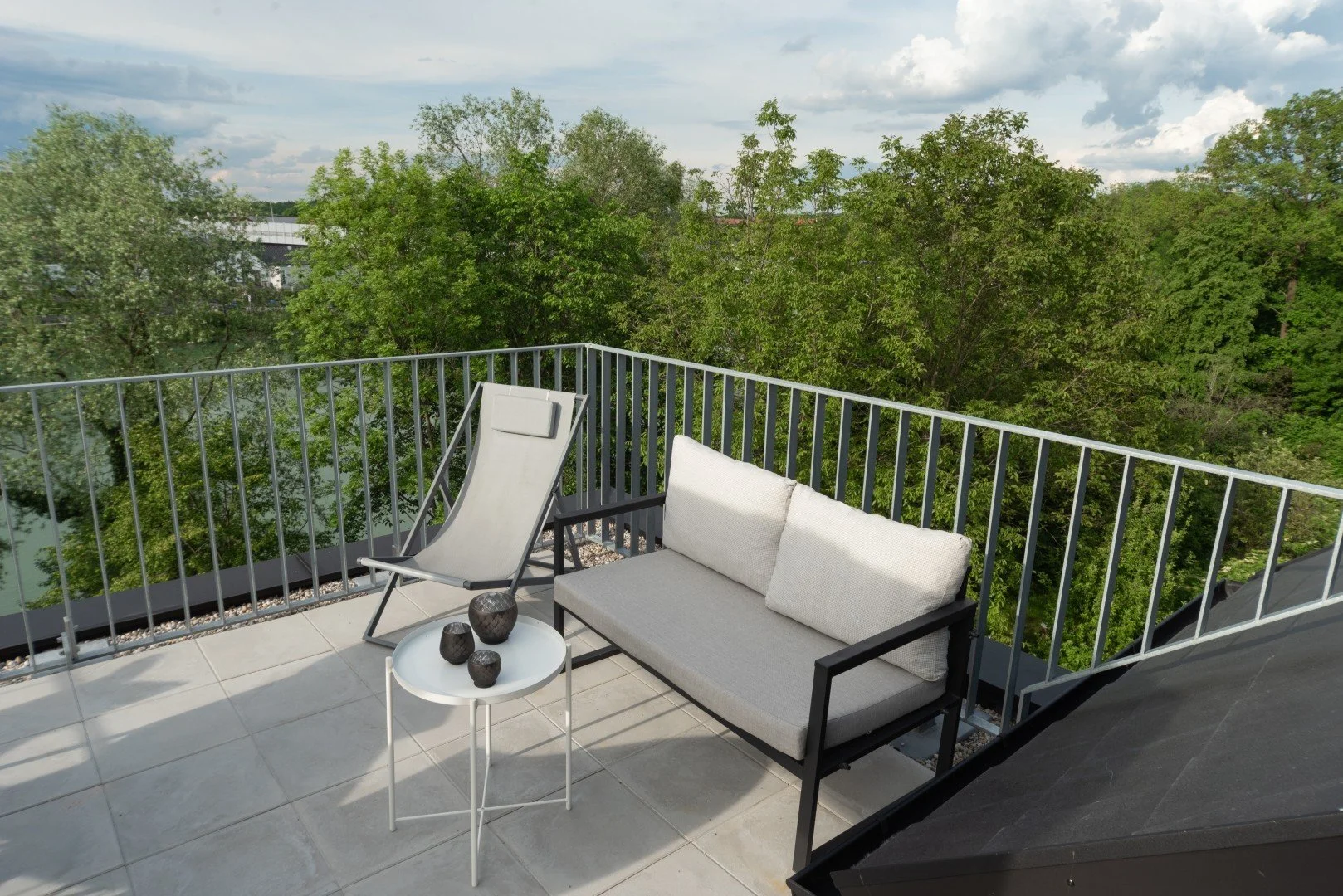 Von der privaten Dachterrasse öffnet sich der Blick über die Umgebung.